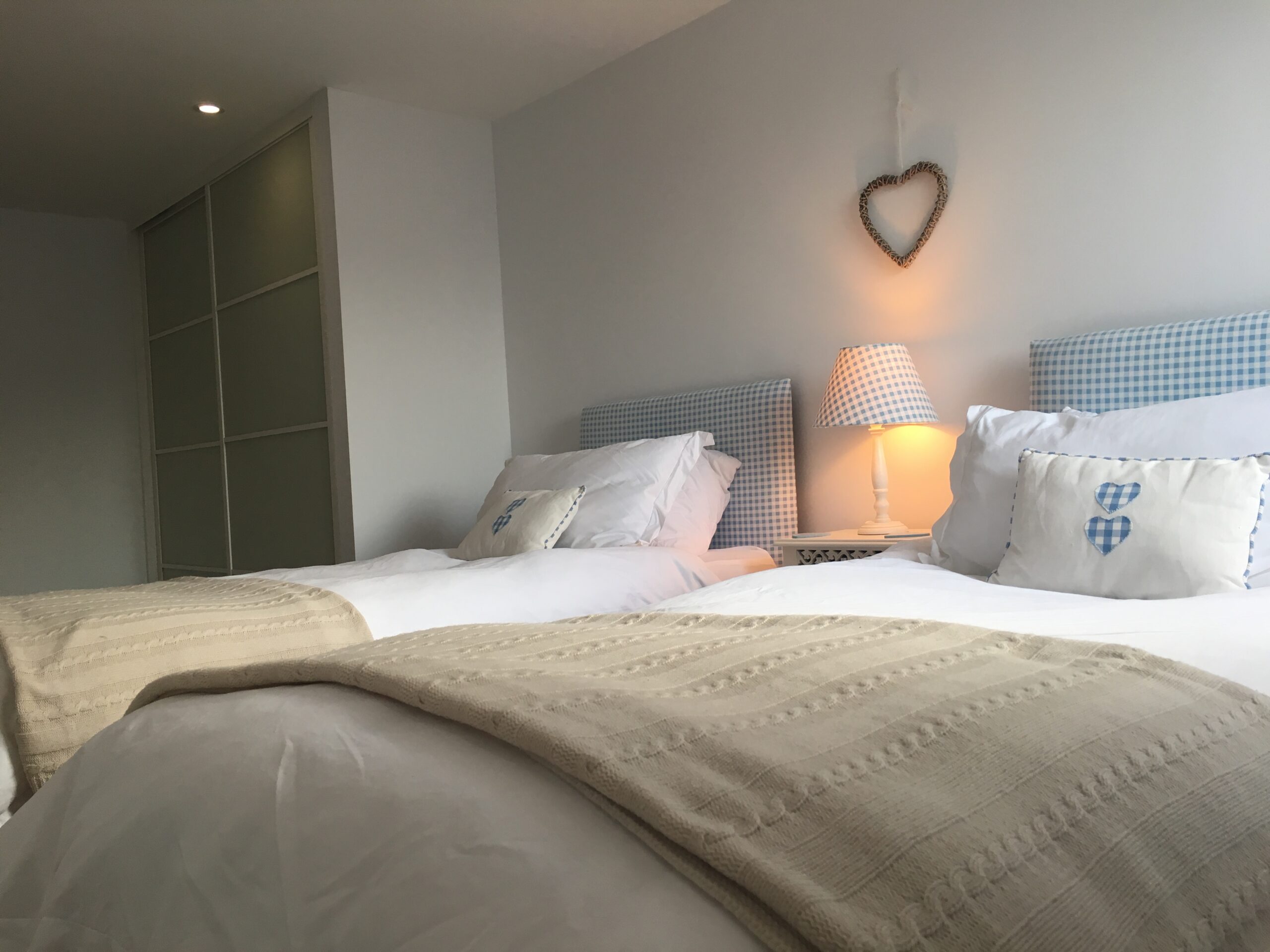 - The pretty twin bedded room features two single beds also with 600 thread count, Egyptian cotton linen, goose feather and down duvets and pillows, a fitted double wardrobe and two white bedside cabinets with lamps